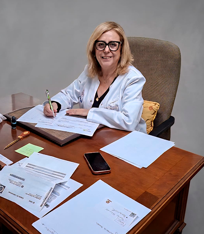 Farmacéutica titular, encargada de administración, papeleos y óptica, coordinando el funcionamiento diario.